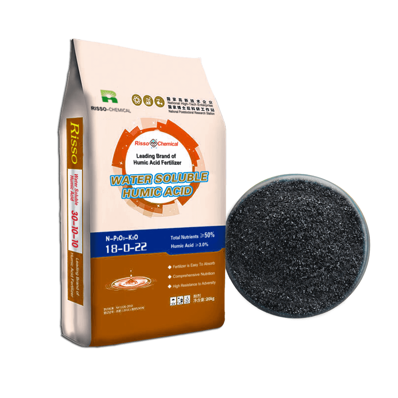 Risso produces two types of humic acid fertilizers: Potassium Fulvate and Bio Fulvic Acid, both designed to enhance soil health and promote plant growth.